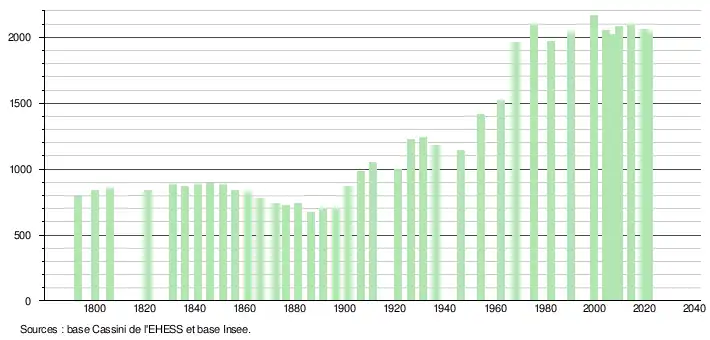 L'évolution du nombre d'habitants est connue à travers les recensements de la population effectués dans la commune depuis 1793. Pour les communes de moins de 10 000 habitants, une enquête de recensement portant sur toute la population est réalisée tous les cinq ans, les populations légales des années intermédiaires étant quant à elles estimées par interpolation ou extrapolation[32]. Pour la commune, le premier recensement exhaustif entrant dans le cadre du nouveau dispositif a été réalisé en 2004[33].