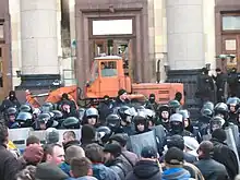 Les troubles se sont d'abord emparés de la ville de Kharkiv le 22 février 2014, lorsque des manifestants d'Euromaïdan ont occupé le bâtiment de l'administration régionale de l'État (RSA) de la ville[181],[182]. Plus tard dans la journée, plusieurs milliers de manifestants tente de renverser une statue de Vladimir Lénine qui se dresse en face du bâtiment RSA sur la place de la Liberté. Plusieurs chauffeurs de taxi défendent le monument, blessant plusieurs manifestants. Le lendemain, plusieurs milliers de manifestants pro-russes se rassemblent sur la place pour protéger la statue[183] et érigent une clôture périphérique autour. Le gouverneur de l'oblast de Kharkiv, Mikhaïl Dobkine, prononce un discours devant les défenseurs de la statue, affirmant que celle-ci représente « un symbole de notre ville... nous la laisserons ici et nous la défendrons »[181]. La police locale sépare les manifestants pro et anti-Maïdan jusqu'au 1er mars[184]. Ce jour-là, des militants pro-russes prennent d'assaut le bâtiment RSA, agresse les militants d'Euromaïdan qui l'occupent et hissent le drapeau russe au-dessus du bâtiment[185]. Certains des manifestants s'avèrent être des citoyens russes qui s'étaient rendus à Kharkiv depuis la Russie[186],[187]. Selon les médias locaux, 2 000 Russes ont été amenés par des bus immatriculés russes à Kharkiv pour participer à la prise d'assaut du bâtiment[188]. Des organisations militantes russes confirment avoir envoyé des Russes pour « manifester pacifiquement » à Kharkiv. La police reprend le contrôle du bâtiment dans la soirée du même jour et remplace le drapeau russe par celui de l'Ukraine[189],[190].