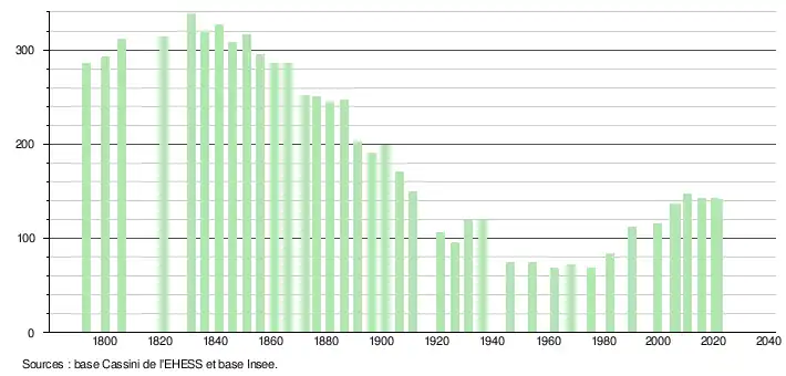 L'évolution du nombre d'habitants est connue à travers les recensements de la population effectués dans la commune depuis 1793. Pour les communes de moins de 10 000 habitants, une enquête de recensement portant sur toute la population est réalisée tous les cinq ans, les populations légales des années intermédiaires étant quant à elles estimées par interpolation ou extrapolation[19]. Pour la commune, le premier recensement exhaustif entrant dans le cadre du nouveau dispositif a été réalisé en 2005[20].