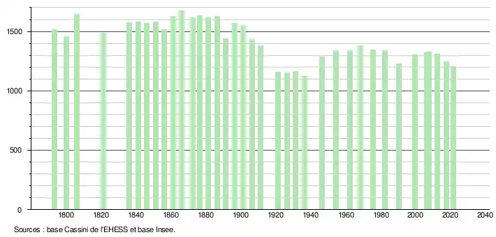 L'évolution du nombre d'habitants est connue à travers les recensements de la population effectués dans la commune depuis 1793. Pour les communes de moins de 10 000 habitants, une enquête de recensement portant sur toute la population est réalisée tous les cinq ans, les populations légales des années intermédiaires étant quant à elles estimées par interpolation ou extrapolation[33]. Pour la commune, le premier recensement exhaustif entrant dans le cadre du nouveau dispositif a été réalisé en 2007[34].