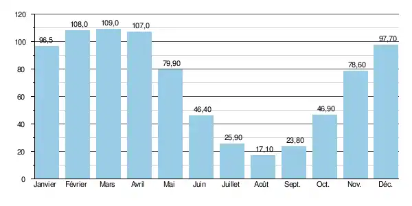 Les crues, quant à elles, peuvent être très importantes. Les QIX 2 et QIX 5 valent respectivement 670 et 1 000 m3/s. Le QIX 10 est de 1 200 m3/s, le QIX 20 de 1 500 m3/s et le QIX 50 de 1 800 m3/s.