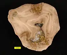 Trypanites borings in an Upper Ordovician hardground from northern Kentucky. The borings are filled with diagenetic dolomite (yellowish). Note that the boring on the far right cuts through a shell in the matrix.