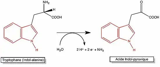 La tryptophane désaminase (TDA) est une oxydoréductase capable de catalyser la libération du groupement amine primaire du tryptophane (W) avec production d'acide indole-pyruvique (AIP), d'ammoniac (ou d'ammonium en fonction du pH) et d'un coenzyme réduit, selon la réaction :