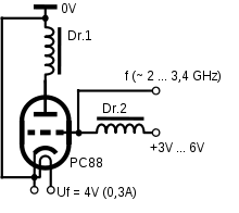 où est exprimée en hertz, d en mètres et U en volts. Ainsi, la fréquence et peut être réglée, mais dans une bande passante limitée, en modifiant les tensions des électrodes. Comparé à un oscillateur à triode conventionnel, le nombre d'électrons frappant réellement la plaque d'anode et la grille est faible, de sorte que les courants alternatifs de la plaque et de la grille sont faibles et la puissance de sortie de l'oscillateur BK est faible[2]. Des appareils plus puissants comme le klystron ont ensuite été développés pour surmonter cette limitation.