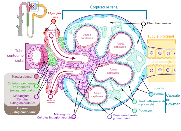 Sa partie contournée est en contact avec l'artériole afférente de son néphron au niveau d'une structure appelée l'appareil juxtaglomérulaire. C'est à ce niveau que se fait la sécrétion de rénine, hormone phare du contrôle de la tension artérielle par le rein.