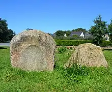 Parmi les blocs constituant l'enceinte, une meule dormante dénommé « bloc no 33 » (1 m de hauteur) et trois blocs décorés ont été découverts. Le bloc dit « bloc no 21 » (2 m de hauteur sur 0,40 m de largeur) comporte des lignes brisées gravées en creux par piquetage. Le bloc dit « bloc no 26 » (1,80 m de hauteur sur 0,40 m de largeur) est orné d'une hache à emmanchure recourbée en crosse, sculptée par bouchardage, disposée avec le manche en bas. Le bloc dit « bloc no 47 » (1,40 m de hauteur sur 0,60 m de largeur) est décoré d'un écusson piqueté en creux lui-aussi renversé tête en bas[1].