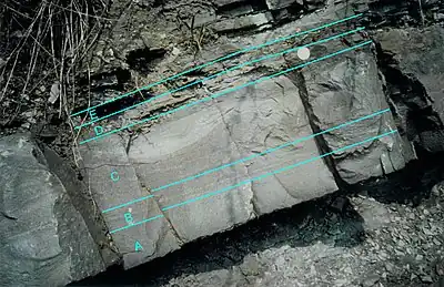 - Niveau Ta : Termes granoclassés constitué de sables grossiers (rudites à arénites). Il présente des figures de bases de banc (Flûtes cast, toolcasts, pistes, bioturbations). Hydrodynamisme fort, domaine des antidunes.