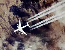 Les émissions polluantes issues de la combustion du kérosène sont l'un des problèmes majeurs du turboréacteur pris « à bras le corps »[21] par les ingénieurs. L'aviation commerciale est responsable de 2,6 % des émissions de CO2 en 2018. Si l'on prend en compte l'ensemble des phénomènes contribuant au forçage radiatif (notamment les cirrus induits par les traînées de condensation), elle a représenté 5,1 % de l'impact climatique sur la période 2000-2018[41].