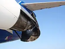Le turboréacteur est la principale source de pollution sonore des avions, mais pas la seule. Les volets et les trains d'atterrissage ont un impact non négligeable, au décollage et à l'atterrissage[21]. En outre, même si on estime que moins de 10 % de la gêne acoustique est due aux aéronefs[21], les turboréacteurs, et plus globalement les moteurs d'avions, génèrent des sons de très basses fréquences qui sont mal atténués par la distance et les murs des maisons modernes. Des progrès significatifs ont néanmoins été réalisés depuis 50 ans puisque le niveau sonore des avions a diminué de plus de 10 dB aussi bien au décollage ou à l'approche qu'en vol[21].