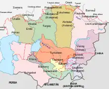 Le Turkestan[1],[2] (turc : Türkistan, littéralement le « Pays des Turcs ») est une région d'Asie centrale[1],[2],[3] située entre la mer Caspienne à l'ouest et le désert de Gobi à l'est[3]. Le Pamir et les monts Tian la divisent en Turkestan occidental[4], à l'ouest, et Turkestan oriental[5], à l'est[3]. Le premier correspond à l'ancien Turkestan russe[1] et couvre le sud du Kazakhstan, le Turkménistan, l'Ouzbékistan, le Tadjikistan, et le Kirghizistan[1],[3], le second correspond à l'ancien Turkestan chinois[1] et couvre le Xinjiang[1],[3]. Un Turkestan afghan est attesté[6].