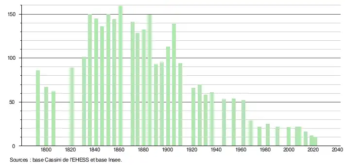 L'évolution du nombre d'habitants est connue à travers les recensements de la population effectués dans la commune depuis 1793. Pour les communes de moins de 10 000 habitants, une enquête de recensement portant sur toute la population est réalisée tous les cinq ans, les populations légales des années intermédiaires étant quant à elles estimées par interpolation ou extrapolation[19]. Pour la commune, le premier recensement exhaustif entrant dans le cadre du nouveau dispositif a été réalisé en 2008[20].