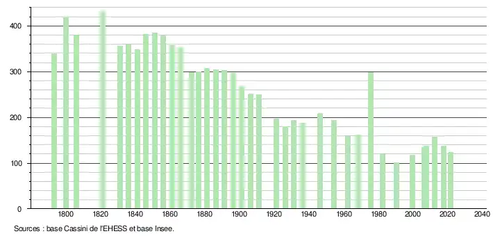 L'évolution du nombre d'habitants est connue à travers les recensements de la population effectués dans la commune depuis 1793. Pour les communes de moins de 10 000 habitants, une enquête de recensement portant sur toute la population est réalisée tous les cinq ans, les populations légales des années intermédiaires étant quant à elles estimées par interpolation ou extrapolation[30]. Pour la commune, le premier recensement exhaustif entrant dans le cadre du nouveau dispositif a été réalisé en 2007[31].
