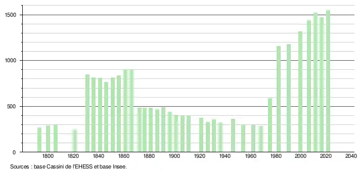 L'évolution du nombre d'habitants est connue à travers les recensements de la population effectués dans la commune depuis 1793. Pour les communes de moins de 10 000 habitants, une enquête de recensement portant sur toute la population est réalisée tous les cinq ans, les populations légales des années intermédiaires étant quant à elles estimées par interpolation ou extrapolation[28]. Pour la commune, le premier recensement exhaustif entrant dans le cadre du nouveau dispositif a été réalisé en 2006[29].