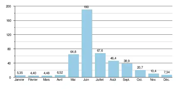 Le débit moyen mensuel observé en février (minimum d'étiage) est de 4,40 m3/s, soit moins de 2,5 % du débit moyen du mois de juin (190 m3/s), ce qui souligne l'amplitude très importante des variations saisonnières. Sur la durée d'observation de 23 ans, le débit mensuel minimal a été de 2,19 m3/s en , tandis que le débit mensuel maximal s'élevait à 320 m3/s en .