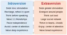 L'extraversion signifie "tourné vers l'extérieur" et l'introversion signifie "tourné vers l'intérieur"[19]. Ces définitions spécifiques varient quelque peu de l'usage habituel de ces mots.