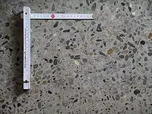 - béton désactivé, dit aussi béton dénudé : nom donné à un béton dont la surface laisse apparaitre les granulats de couleur. Il est obtenu par pulvérisation d'un désactivant sur la surface fraiche d'un béton au moment de son coulage[21]. Ensuite, une fois séché, un rinçage à haute pression de la surface fait apparaitre les granulats[21]. Gardant la résistance du béton, il peut-être décoratif, coloré, et ce traitement lui confère des propriétés antidérapantes[22].