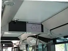 Intérieur d'un bus : vue de l'avant du bus, de l'écran d'information et d'une caméra de surveillance.