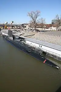Après une escale pour la dédicace de l'Écluse et du Barrage de Montgomery Point le 16 juillet, son transit a été retardé par le Corps du génie de l'armée des États-Unis pour des raisons de sécurité. Une paire de barges a servi de pontons pour soulever le sous-marin de quelques mètres afin de dégager le fond de la rivière tout en restant suffisamment bas pour passer sous les ponts le long de sa route, tout comme l'USS Batfish l'avait fait 32 ans plus tôt.