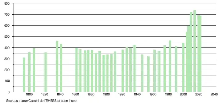 L'évolution du nombre d'habitants est connue à travers les recensements de la population effectués dans la commune depuis 1793. Pour les communes de moins de 10 000 habitants, une enquête de recensement portant sur toute la population est réalisée tous les cinq ans, les populations légales des années intermédiaires étant quant à elles estimées par interpolation ou extrapolation[20]. Pour la commune, le premier recensement exhaustif entrant dans le cadre du nouveau dispositif a été réalisé en 2004[21].