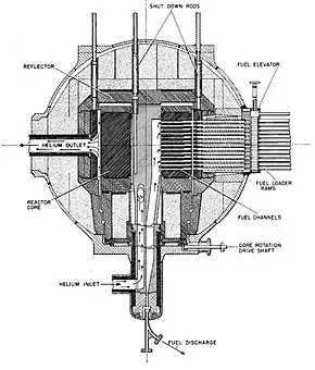 Le renouvellement du combustible pouvait se faire alors que le réacteur fonctionnait à plein régime[5] : il suffisait de faire tourner la tourelle et de pousser le nouvel élément combustible dans le canal, qui chassait alors l'ancien combustible. Le combustible usagé tombait au fond du réacteur où il était récupéré. Selon le taux d'enrichissement de l'uranium et la porosité du graphite, le réacteur utilisait 1 à 6 éléments combustibles par jour et produisait une puissance thermique de 3 MW.