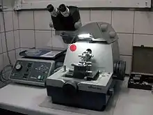Un ultramicrotome est un appareil de très grande précision qui permet des coupes de 80 à 100 nm d'épaisseur servant en microscopie électronique.