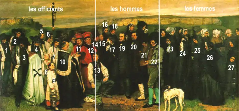 Les 27 personnages pressés en double rang sont tous des habitants d'Ornans que Courbet avait fait poser un à un dans son atelier. Comme à l'église, les hommes (à gauche) et les femmes (à droite) sont séparés. Les hommes portent des costumes noirs et plusieurs d'entre eux un chapeau haut de forme. Les femmes portent des coiffes blanches et des capuches noires ; plusieurs d'entre elles tiennent un mouchoir blanc dans la main et pleurent le mort (la description suivante est issue des données des archives municipales et des actes notariés).