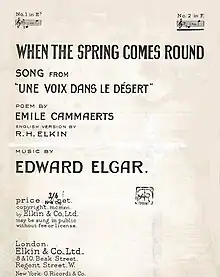 « It is night when the curtain rises, showing the battered dwelling, standing alone in the desolate land, with the twinkling of camp fires along the Yser in the distance, and in the foreground the cloaked figure of a man, who soliloquises on the spectacle to Elgar's music. Then he ceases, and the voice of a peasant girl is heard coming from the cottage, singing a song of hope and trust in anticipation of the day the war shall be ended [ "Quand nos bourgeons se rouvriront" ("When the spring comes round again") ] ... The wayfarer stands transfixed as he listens to the girl's brave song, and then, as he comments again on her splendid courage and unconquerable soul, the curtain slowly falls. »