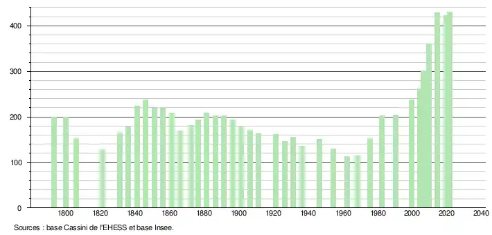 L'évolution du nombre d'habitants est connue à travers les recensements de la population effectués dans la commune depuis 1793. Pour les communes de moins de 10 000 habitants, une enquête de recensement portant sur toute la population est réalisée tous les cinq ans, les populations légales des années intermédiaires étant quant à elles estimées par interpolation ou extrapolation[13]. Pour la commune, le premier recensement exhaustif entrant dans le cadre du nouveau dispositif a été réalisé en 2004[14].
