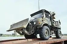 Daimler-Benz a installé un système hydraulique de WABCO de Hanovre. Il est plus robuste et plus puissant que le système hydraulique installé dans l'Unimog 411 dès le début des années 1960[49] et se compose de six éléments principaux : une pompe à huile à engrenages, un réservoir d'huile, deux vérins hydrauliques et deux appareils de contrôle. La pompe hydraulique d'origine est de type 5 P 41-13 et a un débit de 32 l/min à 150 bars de pression. Cette pompe fut bientôt remplacée par une version plus puissante avec 40 l/min à 180 bars. Le réservoir d'huile est situé à l'avant de l'Unimog; l'ensemble du circuit d'huile a une capacité de 18 litres. Les deux appareils de contrôle sont situés derrière le moteur et disposent chacun d'un levier de commande; les leviers de commande sont montés sur une tige sous le volant. Avec le premier levier, le conducteur peut actionner soit le vérin télescopique pour basculer la plate-forme, soit le vérin hydraulique du relevage arrière. Le deuxième levier est utilisé pour contrôler les accessoires[50].