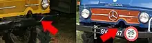 L'échancrure pour la prise de force dans le pare-chocs avant a été ajoutée en 1964, l'Unimog de droite ne l'a pas.