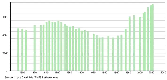 L'évolution du nombre d'habitants est connue à travers les recensements de la population effectués dans la commune depuis 1793. Pour les communes de moins de 10 000 habitants, une enquête de recensement portant sur toute la population est réalisée tous les cinq ans, les populations légales des années intermédiaires étant quant à elles estimées par interpolation ou extrapolation[33]. Pour la commune, le premier recensement exhaustif entrant dans le cadre du nouveau dispositif a été réalisé en 2008[34].