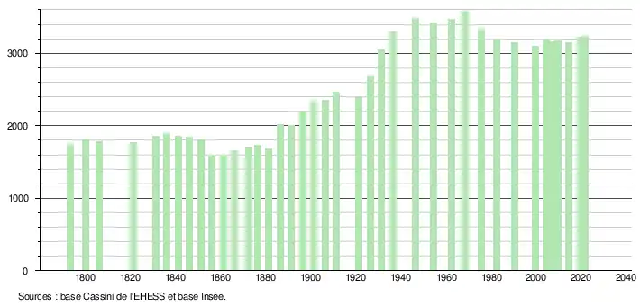 L'évolution du nombre d'habitants est connue à travers les recensements de la population effectués dans la commune depuis 1793. Pour les communes de moins de 10 000 habitants, une enquête de recensement portant sur toute la population est réalisée tous les cinq ans, les populations légales des années intermédiaires étant quant à elles estimées par interpolation ou extrapolation[26]. Pour la commune, le premier recensement exhaustif entrant dans le cadre du nouveau dispositif a été réalisé en 2004[27].