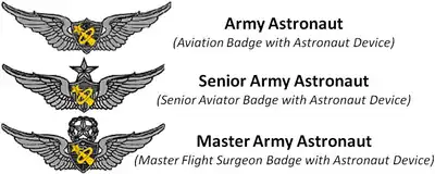 Chaque armée émet sa propre version de l'insigne d'astronaute, qui consiste en un insigne d'aviation standard avec un symbole d'astronaute (étoile filante dans un halo) centré sur le bouclier ou l'écusson de l'insigne. Les insignes d'astronaute de l'Armée de l'Air et de l'Armée de terre des États-Unis sont délivrés à trois niveaux : Basic, senior, et command (Air Force)/master (Army). L'insigne d'astronaute de niveau supérieur est indiqué par une étoile centrée au-dessus de la décoration, tandis que le niveau de commandement/maître est indiqué par une étoile et une couronne.