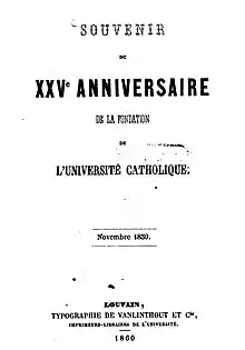 • 1860 : Souvenir du XXVe anniversaire de la fondation de l'Université catholique: , Louvain, typographie Vanlinthout et Cie, 1860 Souvenir du XXVe anniversaire de la fondation de l'Université catholique, Novembre 1859.