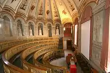 - Aula Scarpa : situé au rez-de-chaussée dans l'angle nord-est de la première cour. C'est le théâtre anatomique construit par Antonio Scarpa. Le premier projet élaboré par Giuseppe Piermarini a été suivi par celui définitif de Leopoldo Pollack, créé entre 1785 et 1786. Il a une forme semi-circulaire sur des marches pour permettre aux étudiants d'assister à des cours d'anatomie basés sur la dissection de cadavres. L'anatomiste Antonio Scarpa a été l'un des premiers à comprendre l'importance d'un lien étroit entre médecine et chirurgie. Cette dernière était considérée comme une branche moins noble du savoir médical, à confier à des non-médecins. Cette innovation est allégoriquement représentée par deux hommes sur la voile centrale au-dessus de la chaise, représentant la médecine et la chirurgie se serrant la main dans un geste de gratitude. Sur les autres voiles, des grotesques alternent avec des figures ailées tenant les outils du métier de chirurgien[13].