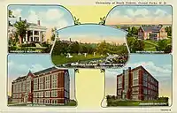 Progressivement, d'autres bâtiments furent édifiés sur le campus, et les liens avec la ville furent améliorés grâce à un système de trolley. Le développement de l'université subit néanmoins plusieurs interruptions. En 1918, l'UND fut l'institution la plus sévèrement touchée par une épidémie de grippe qui fit 1 400 victimes dans le Dakota du Nord[8]. Plus tard cette même année, les cours furent suspendus afin de transformer le campus en base de l'armée dans le cadre de la Première Guerre mondiale[8]. Durant la Grande Dépression, l'UND hébergea gratuitement les étudiants acceptant en retour d'accomplir des travaux manuels sur le campus[9]. Ils étaient logés à un endroit qui fut informellement appelé Camp Depression et qui comprenait des cambooses, c'est-à-dire des wagons de train désaffectés servant habituellement d'abri au personnel. Chacune d'entre elles accueillait huit étudiants[9]. On leur attribuait gratuitement les restes au réfectoire et ils pouvaient profiter de la générosité d'un certain nombre d'habitants de Grand Forks.