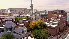 Au milieu des années 1970, la construction du campus de l'Université du Québec à Montréal se confirme dans le quartier Saint-Jacques. La vieille église Saint-Jacques de Montréal est condamnée et les fidèles sont déplacés vers la chapelle Notre-Dame-de-Lourdes de Montréal. L'architecte de l'université, Dimitri Dimakopoulos, choisit de respecter les plans de John Ostell et de Victor Bourgeau en décidant de greffer la nouvelle construction autour du mur de la nef de l'église donnant sur la rue Sainte-Catherine et en mettant en relief le clocher et son portail. Ces vestiges sont classés monuments historiques par le gouvernement du Québec. Les pavillons Hubert-Aquin et Judith-Jasmin sont inaugurés en , marquant les débuts du nouveau campus de l'UQAM[9]. Ce campus prendra de l'ampleur au fil des années : le pavillon Thérèse-Casgrain est inauguré à l'automne 1989[10]. Le pavillon de Danse (ancien pavillon Latourelle), qui sied sur la rue Cherrier, s'ajoute en 1991[10]. Le pavillon des Sciences de la gestion est inauguré en 1990, et prend le nom J.A. De Sève à partir de 1995[11], il est inauguré officiellement sous cette appellation en 1999[12]. Le pavillon de Mode est inauguré le afin d'accueillir l'École supérieure de mode. L'architecte Julia Lianis, signe la modernisation du bâtiment, situé sur la rue Sainte-Catherine[13].