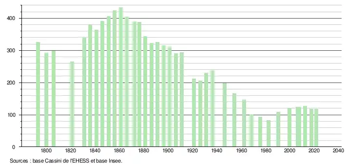 | L'évolution du nombre d'habitants est connue à travers les recensements de la population effectués dans la commune depuis 1793. Pour les communes de moins de 10 000 habitants, une enquête de recensement portant sur toute la population est réalisée tous les cinq ans, les populations légales des années intermédiaires étant quant à elles estimées par interpolation ou extrapolation[37]. Pour la commune, le premier recensement exhaustif entrant dans le cadre du nouveau dispositif a été réalisé en 2007[38]. En 2021, la commune comptait 117 habitants[Note 5], en diminution de 3,31 % par rapport à 2015 (Ariège : +1,38 %, France hors Mayotte : +1,84 %). |