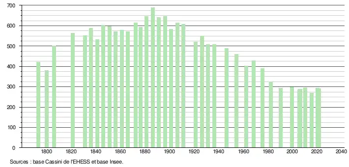 L'évolution du nombre d'habitants est connue à travers les recensements de la population effectués dans la commune depuis 1793. Pour les communes de moins de 10 000 habitants, une enquête de recensement portant sur toute la population est réalisée tous les cinq ans, les populations légales des années intermédiaires étant quant à elles estimées par interpolation ou extrapolation[16]. Pour la commune, le premier recensement exhaustif entrant dans le cadre du nouveau dispositif a été réalisé en 2005[17].