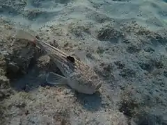 Ce poisson vit généralement enfoui dans le sable, où il agit un leurre formé par une déformation de sa gencive afin d'appâter des proies, puis de les engloutir d'un coup.