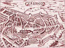 - La seconde veut que le toponyme Urbino dérive du latin urbs-urbis signifiant Ville et se référerait à sa nature de ville double : urbs bina parce que développée sur deux cols.