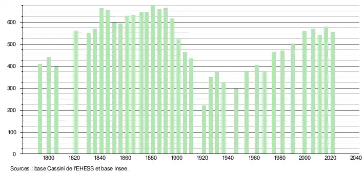 L'évolution du nombre d'habitants est connue à travers les recensements de la population effectués dans la commune depuis 1793. Pour les communes de moins de 10 000 habitants, une enquête de recensement portant sur toute la population est réalisée tous les cinq ans, les populations légales des années intermédiaires étant quant à elles estimées par interpolation ou extrapolation[23]. Pour la commune, le premier recensement exhaustif entrant dans le cadre du nouveau dispositif a été réalisé en 2006[24].