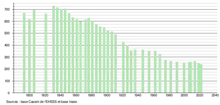 | L'évolution du nombre d'habitants est connue à travers les recensements de la population effectués dans la commune depuis 1793. Pour les communes de moins de 10 000 habitants, une enquête de recensement portant sur toute la population est réalisée tous les cinq ans, les populations légales des années intermédiaires étant quant à elles estimées par interpolation ou extrapolation[31]. Pour la commune, le premier recensement exhaustif entrant dans le cadre du nouveau dispositif a été réalisé en 2008[32]. En 2021, la commune comptait 240 habitants[Note 7], en diminution de 8,05 % par rapport à 2015 (Landes : +4,9 %, France hors Mayotte : +1,84 %). |