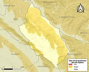Le retrait-gonflement des sols argileux est susceptible d'engendrer des dommages importants aux bâtiments en cas d’alternance de périodes de sécheresse et de pluie. 58,3 % de la superficie communale est en aléa moyen ou fort (19,2 % au niveau départemental et 48,5 % au niveau national). Sur les 135 bâtiments dénombrés sur la commune en 2019, 84 sont en aléa moyen ou fort, soit 62 %, à comparer aux 17 % au niveau départemental et 54 % au niveau national. Une cartographie de l'exposition du territoire national au retrait gonflement des sols argileux est disponible sur le site du BRGM[30],[Carte 2].