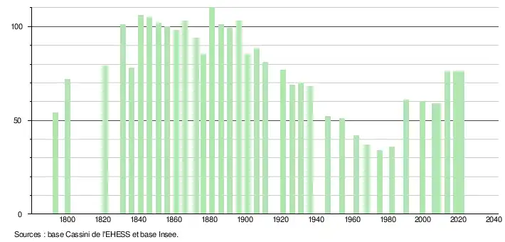 L'évolution du nombre d'habitants est connue à travers les recensements de la population effectués dans la commune depuis 1793. Pour les communes de moins de 10 000 habitants, une enquête de recensement portant sur toute la population est réalisée tous les cinq ans, les populations légales des années intermédiaires étant quant à elles estimées par interpolation ou extrapolation[32]. Pour la commune, le premier recensement exhaustif entrant dans le cadre du nouveau dispositif a été réalisé en 2008[33].