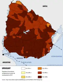 - Ethnographie : la majorité des Uruguayens sont des descendants d'Européens arrivés au XIXe siècle, dont la plupart étaient originaires d'Espagne ou d'Italie, avec une forte minorité française : à la fin du XIXe siècle, un tiers de la population était d'origine française[50]. L'immigration continue d'être majoritairement aujourd'hui européenne et plus particulièrement d'Europe du Sud. Environ 80 000 personnes en Uruguay sont nées à l'étranger (2 %), dont la moitié provient de l'Espagne et le reste principalement d'Italie, d'Argentine, du Brésil et d'Israël.