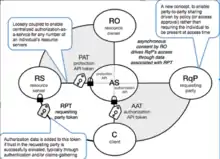 - Deuxièmement UMA définit une notion formelle de demandeur de requête ou "Requesting party" (RqP) qui est autonome du point de vue du serveur de ressource (RO) ce qui permet le partage de ressources de parti à parti et la délégation de l'autorisation d'accès. Un propriétaire de ressources (RO) n'a pas besoin de consentir à l'émission de jetons en temps réel, mais peut définir la politique d'accès à l'avance par l’intermédiaire du serveur d’autorisation (AS), ce qui permet à un demandeur de requête (RqP) de tenter un accès asynchrone.