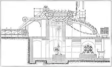 La machine était principalement composée de deux cadres triangulaires verticaux, renforcés par des entretoises. Les cadres étaient reliés à chacun des trois angles par un axe portant deux roues dentées qui actionnaient deux chaînes sans fin dans des plans verticaux parallèles aux cadres. Les chaînes portaient à intervalles réguliers des crochets destinés à recevoir et à soulever les bois équarris, qui étaient amenés au pied de la machine sur des chariots Decauville. A l'arrière de la machine se trouvaient deux paires de bras inclinés qui pouvaient être soulevés verticalement à l'aide d'un treuil actionné par un petit moteur électrique lorsque la pile prenait de la hauteur. Deux ouvriers placés à l'avant, au pied de la machine, plaçaient le bois équarri ou les poutres un par un dans les crochets fixés aux chaînes de levage. Lorsque le bois atteignait le sommet de la machine, il était basculé sur deux crochets plus longs. Ces longs crochets, tournés dans le sens inverse des crochets de levage, soutenaient le bois dans sa descente à l'arrière de la machine jusqu'à ce qu'il atteigne les bras inclinés. Ces bras prenaient le bois sur les crochets (qui continuaient à descendre avec les chaînes) et le faisaient glisser dans les mains d'un ouvrier qui se tenait sur la pile. Celui-ci passait le bois à ses collègues, qui le déposaient à sa place.