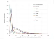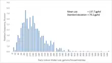 L'utilisation résidentielle d'eau à l'intérieur peut varier considérablement d'un ménage à l'autre en fonction du nombre de résidents (ou plus précisément de la taille et de la composition familiale de chaque ménage) et en fonction d'autres circonstances (systématiques et aléatoires). Cela dépend également de la contribution des divers usages domestiques de l'utilisation de l'eau à la variabilité de l'utilisation totale intérieure. La distribution des volumes quotidiens moyens observés pour huit utilisations finales principales de l'eau montre également une variabilité considérable et un biais vers les queues droites des distributions (les données sur la figure avec les distributions des volumes d'utilisation finale sont tronquées à 120 gpd pour améliorer la séparation des graphiques de distribution. Pour inclure toutes les observations dans la queue droite des distributions, il faudrait étendre l'échelle horizontale à 560 gpd (pour capturer les volumes maximaux observés de 553 gphd pour les fuites, de 345 gphd pour les robinets et de 223 gphd pour les toilettes). Parmi les huit utilisations finales intérieures, cinq (c.-à-d. fuites, rinçage des toilettes, douche, lavage des vêtements et utilisation des robinets) montrent une inclinaison droite prononcée dans leur distribution qui contribue à la queue plus lourde et plus longue à l'intérieur. Des réductions significatives de certaines utilisations finales de l'eau pourraient être obtenues non seulement par l'adoption de technologies efficaces (appareils et accessoires) mais aussi par de petits changements de comportement des consommateurs, pour réduire l'utilisation et le gaspillage de l'eau, et en éliminant les fuites côté client grâce à des programmes automatisés de mesure et d'alerte des fuites[18].