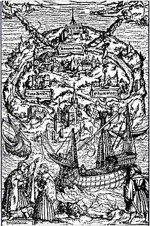 - L'abbaye de Thélème dans Gargantua de Rabelais, 1534. L'ouvrage fait écho aux débats idéologiques nés des progrès de l'humanisme. Gargantua est une parodie de l'historiographie contemporaine. L'abbaye de Thélème est fondée à la fin du roman, et a pour devise "Fais ce que tu voudras". Dans Pantagruel, Rabelais écrit que, Badebec, la mère de Pantagruel, est la fille du roi des Amaurotes en Utopie[18], référence à Thomas More qui, dans son ouvrage L'Utopie, nomma Amaurote la capitale de l'île d'Utopie[19]. Le pays d'Utopie, dans le texte Pantagruel de Rabelais, revient à plusieurs reprises dans le récit, notamment dans les chapitres 23, 24 et 29.